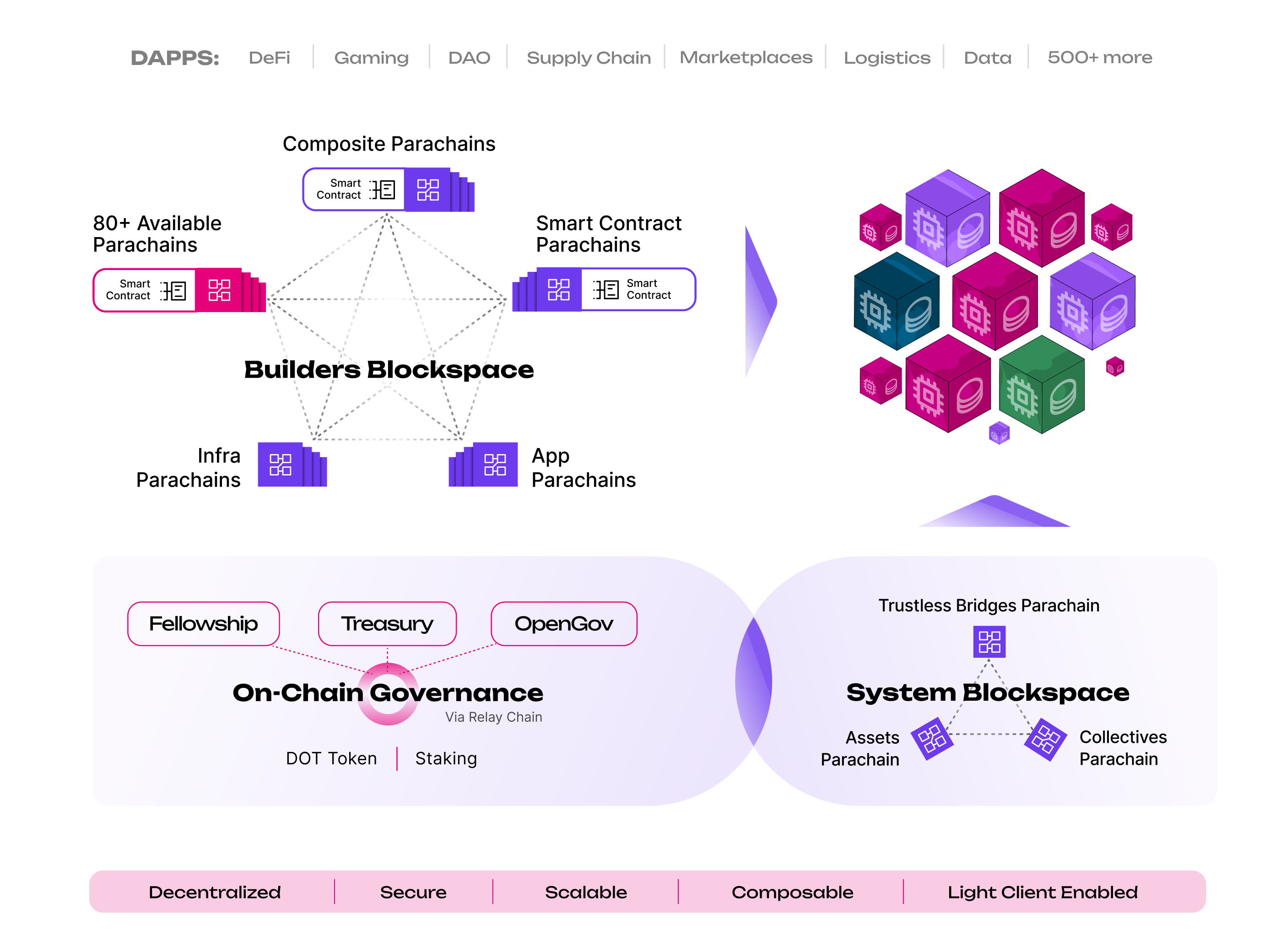 Polkadot’s blockspace ecosystem combines all of these elements to shape the foundations for fit-for-purpose blockspace that’s presented in a seamless and consistent way to dapp builders, all without them needing to understand the source.