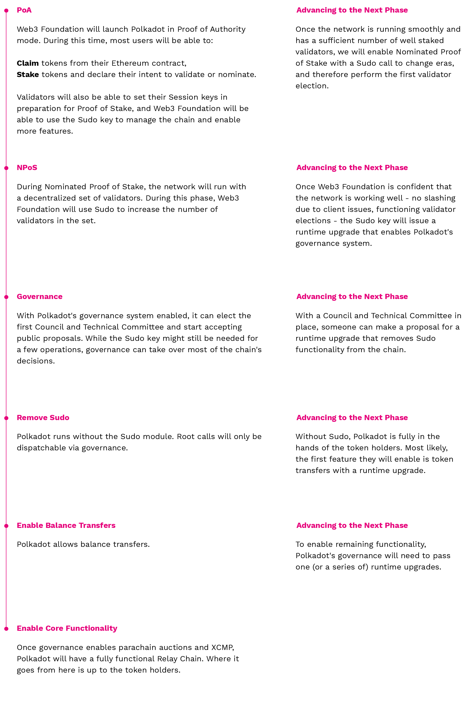 The Polkadot network will have a phased roll-out plan, with important milestones toward decentralization marking each phase in the process.