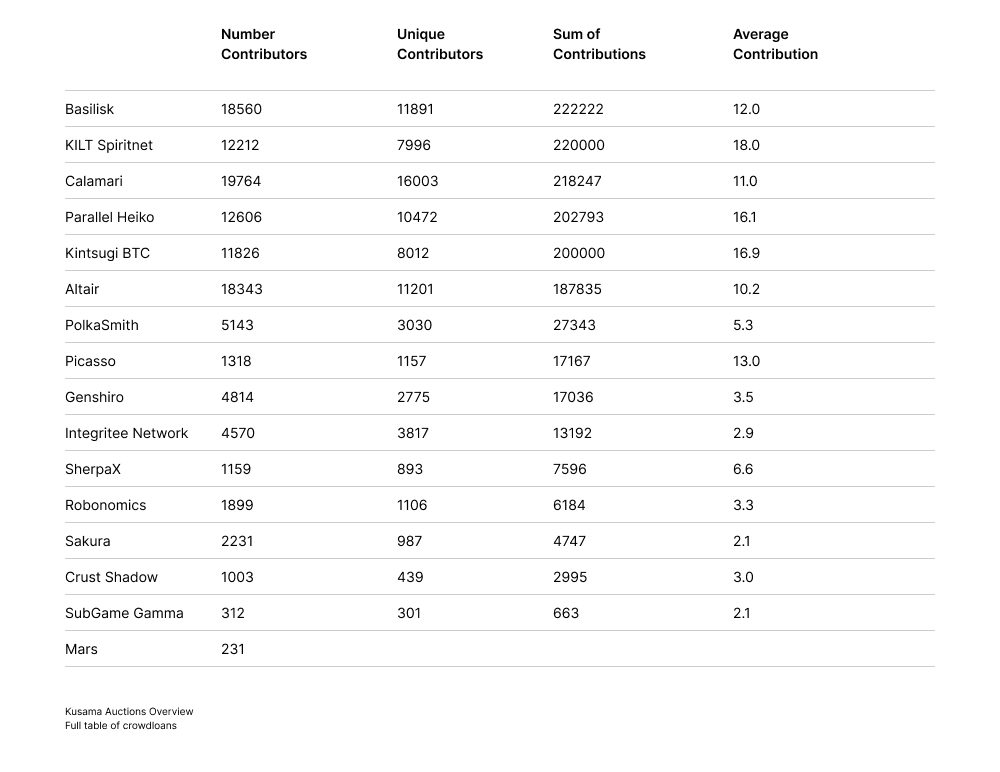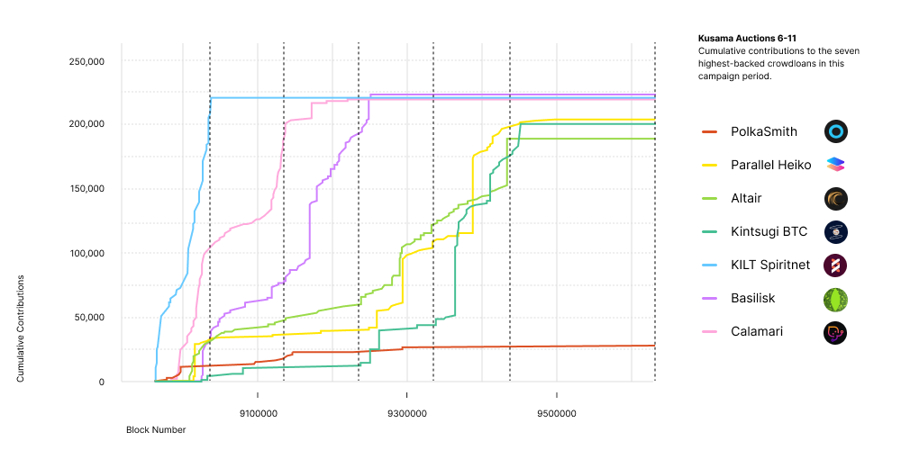The second batch of auctions on Kusama has concluded and all parachains have been successfully onboarded. The winners of this batch of auctions, in order, were KILT Spiritnet, Calamari Network, Basilisk, Altair, Parallel Heiko, and Kintsugi BTC. In this batch of auctions, there are three things to highlight: