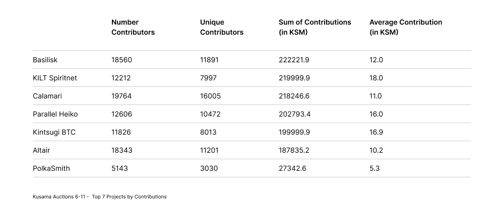The following table summarizes relevant metrics for the seven projects with the highest locked KSM for crowdloans, ordered by the amount of contributions (the full table is available in the Appendix).