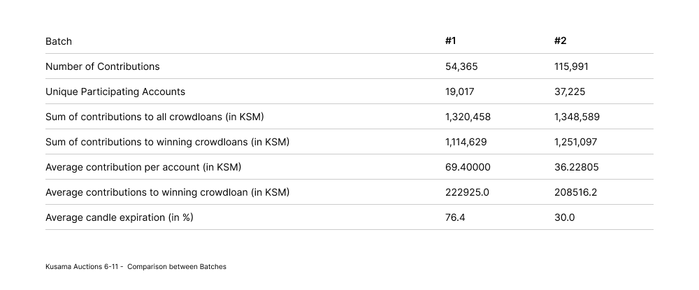 The average contributions for winning crowdloans (i.e., the amount of tokens required to be bonded for a slot) was higher in the first batch, on average, than in the second batch. This is mainly due to the crowdloan by Karura, which received around 501,000 KSM. Given that the second batch of auctions had roughly double the number of contributions, while the total amount of KSM locked was similar in both auctions, the average contribution per account was roughly half in the second batch.