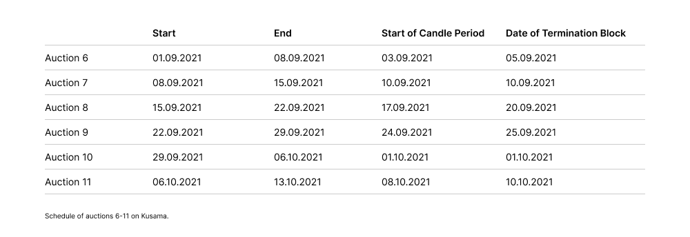 When Kusama’s governance body enabled the second batch of auctions, the plan was to allocate another set of five parachain slots. Later and after some discussion within the community, the council, as representatives of the token holders, scheduled a sixth auction. This brings the total number of parachains (at the time of writing) to twelve — eleven allocated by auctions and one, Statemine, allocated by governance as a common good parachain. This was possible because experts agreed on the technical stability of the network and because there was enough time to fit in an auction before the start of the subsequent lease period. In total, the second batch of 6 auctions ran from September 1st until October 13th. Each auction lasted seven days with a two-day starting period and a five-day ending period (candle phase). The table below provides the dates for the four important events of each auction (the same table with the events expressed in their block heights can be found in the Appendix).