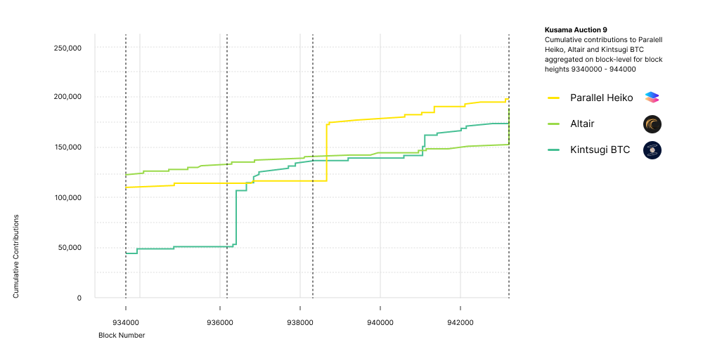 We can see that Altair led the cumulative sum of contributions in the starting period and some time at the beginning of the decisive ending period. Specifically, they led around 35.2% of the ending period. Eventually, in block number 9387388 (26.09.2021), Parallel Heiko’s crowdloan received a single contribution of 57,320 KSM which led to their crowdloan moving ahead in the auction and becoming the winning bid. Eventually, Kintsugi BTC also managed to overtake Altair, putting Altair in last place. Altair once again surpassed Kintsugi BTC shortly before the end of the bidding phase to obtain second place. By the end of the auction, contributors had bonded 187,835.2 KSM for Altair, 196,985.7 KSM for Parallel Heiko, and 173,299.2 KSM for Kintsugi BTC. Technically, either Altair or Parallel Heiko could have won in this close race. Kintsugi BTC was not eligible to win at any point because they never had the top bid during the ending period. In the following graph, we increase the resolution to aggregated contributions on a block-level and focus only on the time of the auction itself.