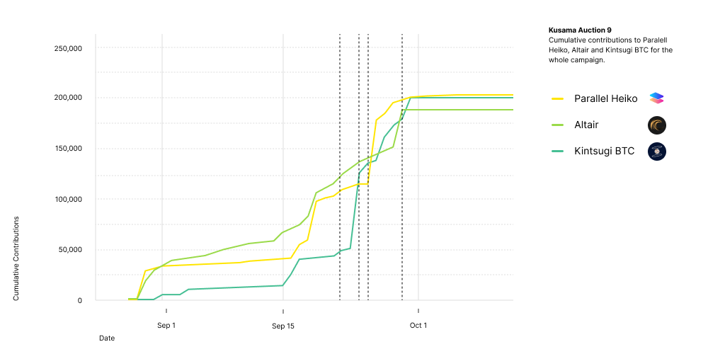 First, we saw, for the first time ever in any Kusama auction, that the candle mechanism picked a winner that was not in the lead at the end of the auction. This further emphasizes the importance of contributing as early as possible during the ending period, both for users as well as teams that might help their own crowdloan.