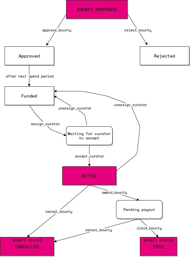 Una vez que la propuesta de recompensa sea aprobada por mayoría simple del Consejo y se elija al curador, se convertirá en una recompensa activa y la cantidad destinada a su pago se guardará en el Tesoro, destinada únicamente a este fin. Cualquier token holder puede presentar una propuesta de recompensa y establecer una recompensa. De manera similar al mecanismo de propinas, las propuestas de recompensas requieren un depósito calculado como una cuota básica añadida a una cuota de byte por duración de la razón.
