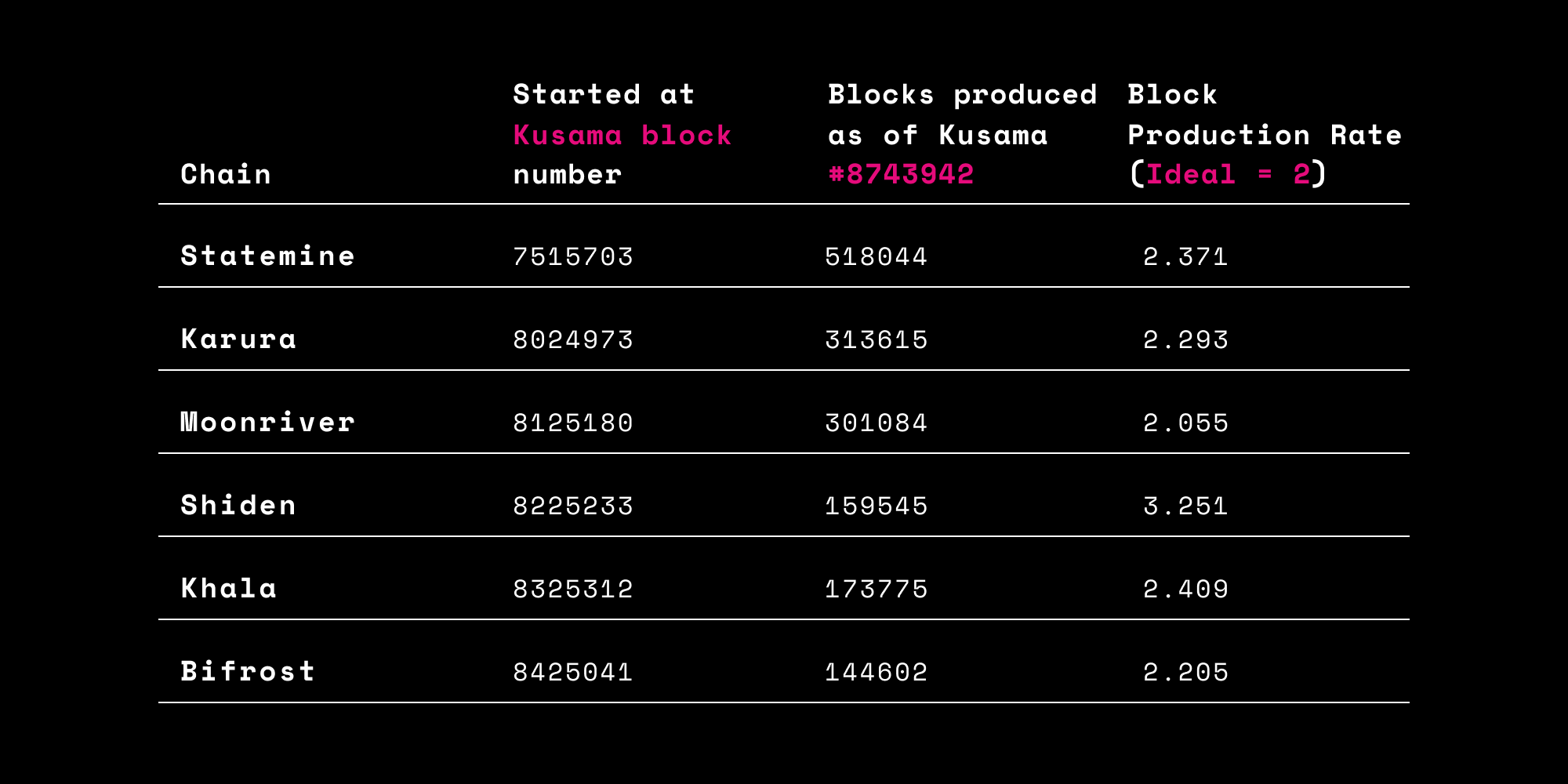The table below shows the values for the 6 current parachains as of a recent block number (#).