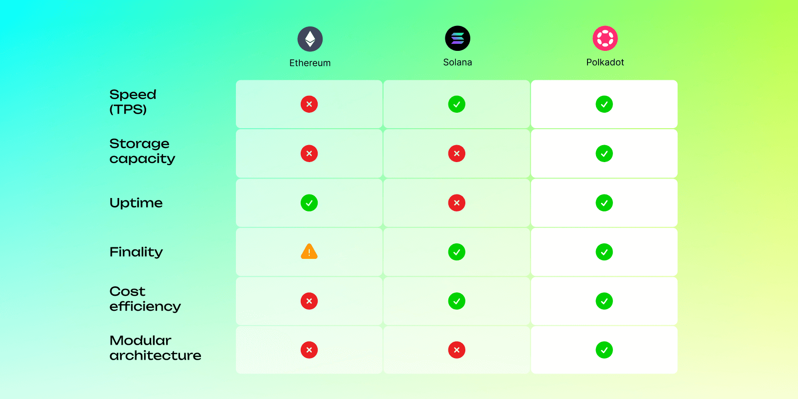 Polkadot's modular approach introduces coordination complexity across multiple chains, but solves this through native cross-chain messaging (XCM) that's built into the protocol layer rather than requiring third-party bridges. This enables Polkadot to handle all five functions without the typical tradeoffs between speed, scalability, and security.