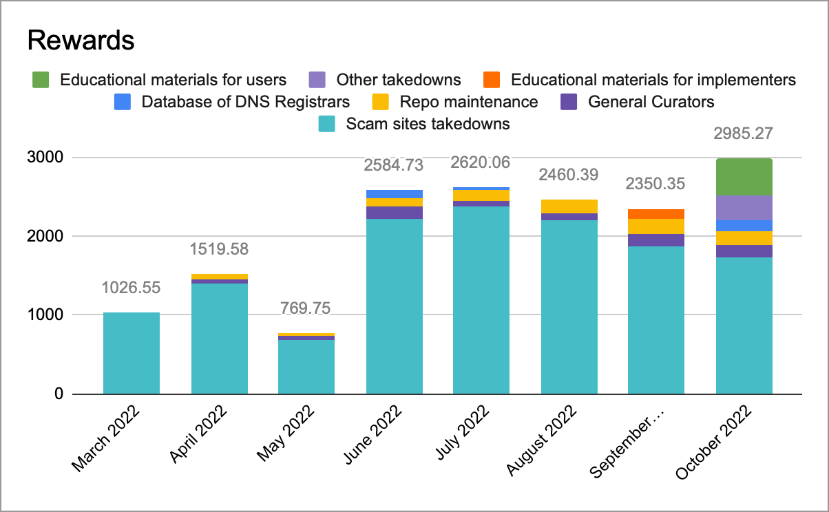 Community members also have a list of scam sites in Polkadot’s phishing repo with all the domains they find during their searches - even if they are not targeting Polkadot and are thus not eligible for reward. As a result, the blocklist has grown from around 200 sites when the anti-scam efforts started in April 2021 to almost 14,000 entries by the end of October 2022.